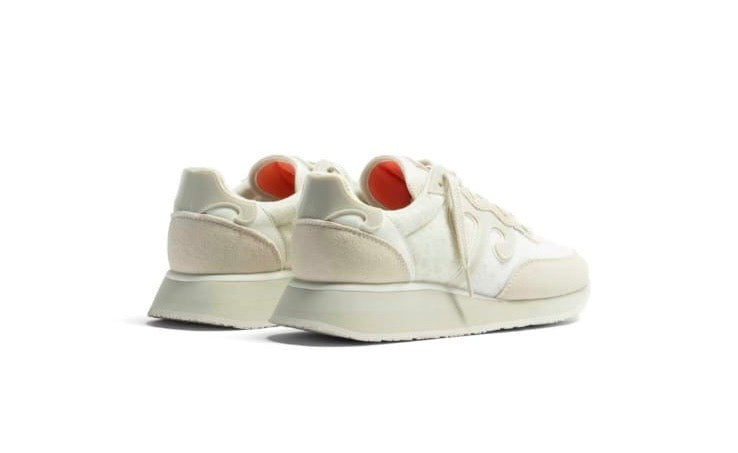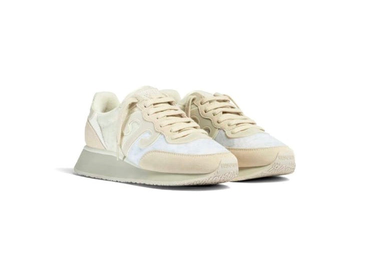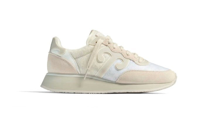 Camoscio color Cloud Cream. Lana color Snow White e White Asparagus. Logo color Birch. Laccio color Egret e secondo laccio color Cloud Cream.
